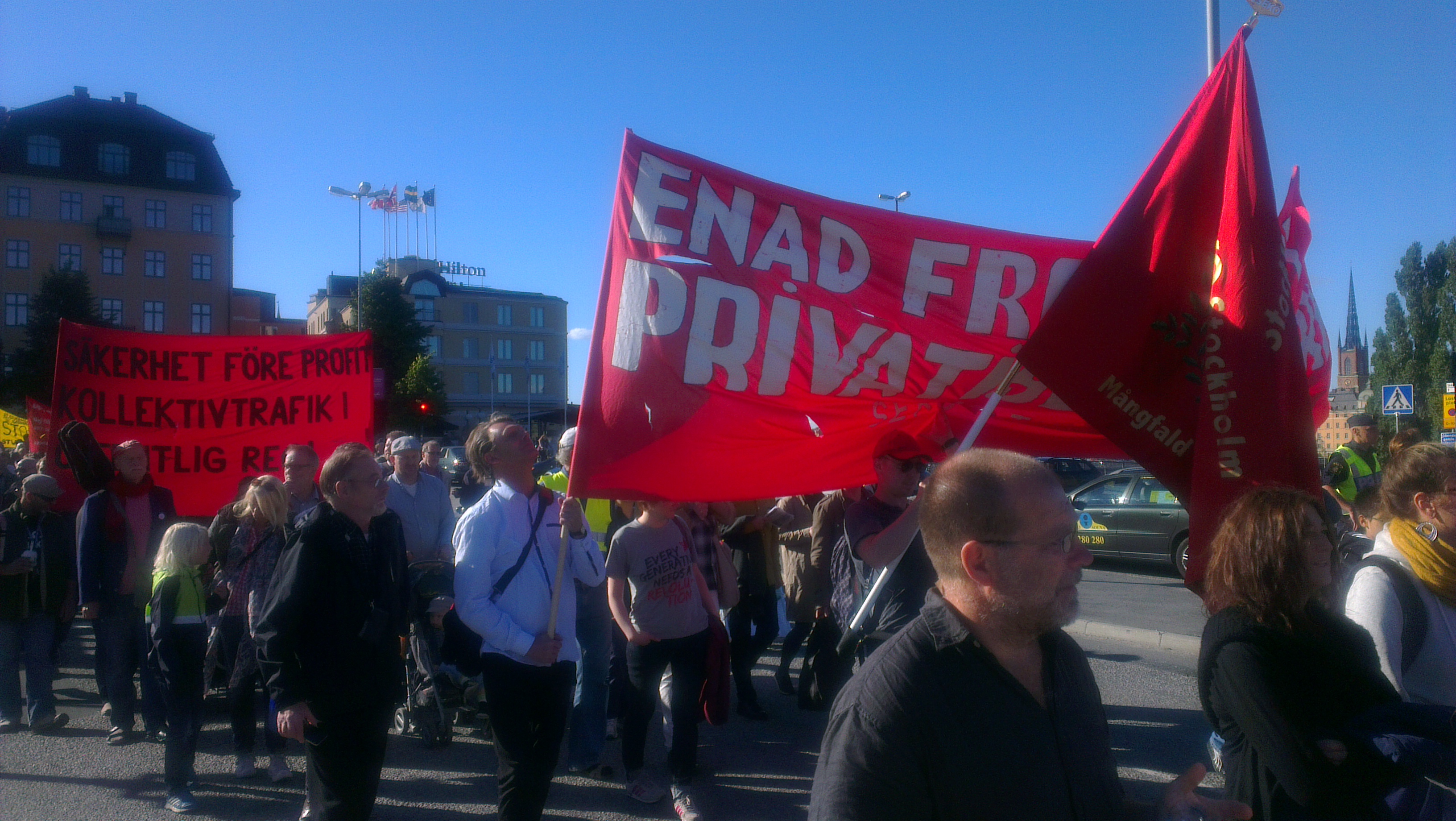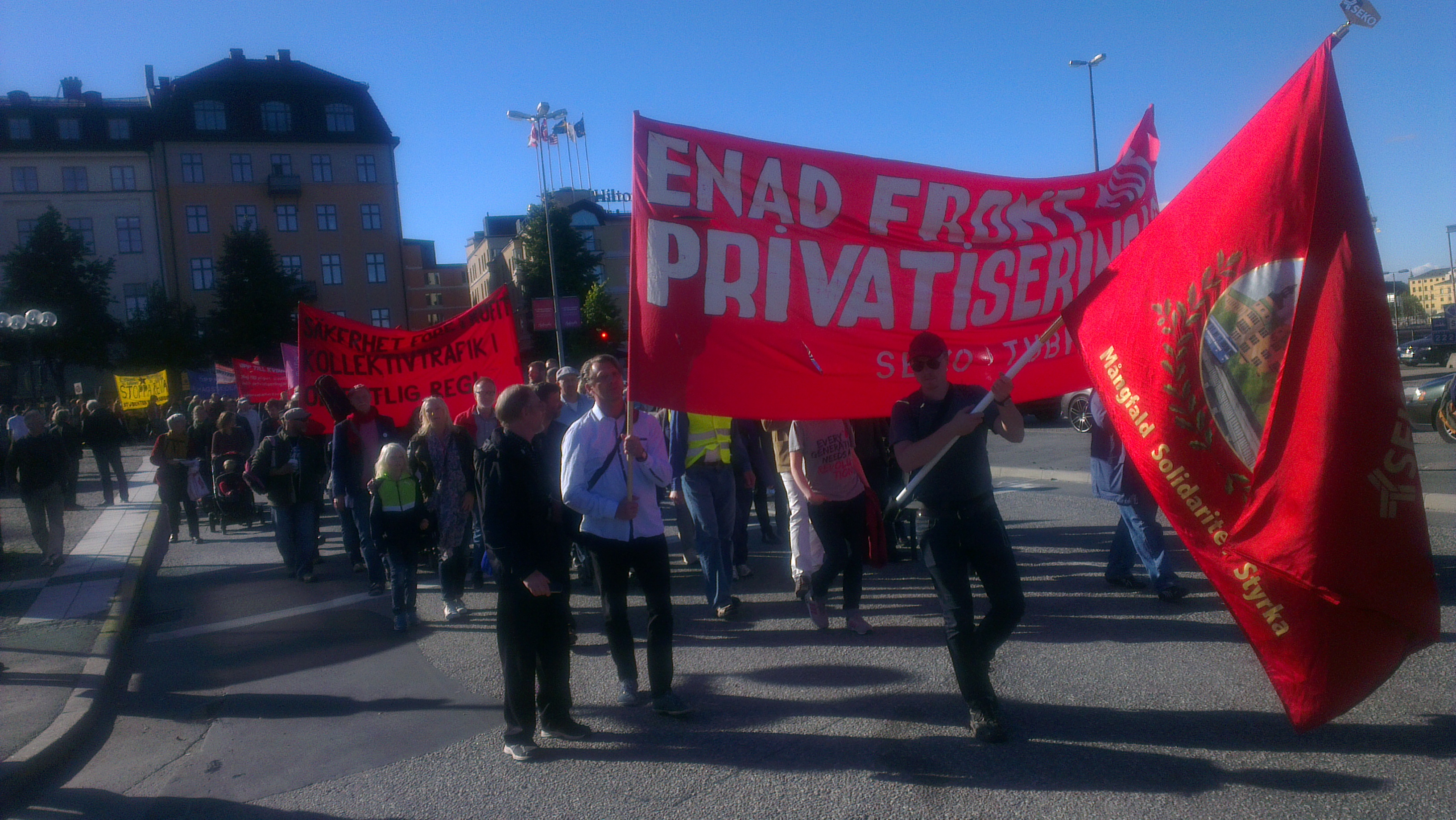Vi demonstrerar i den fackliga block bakom våra paroller, ”Kollektivtrafik i offentlig regi” och ”Alla för en och en för alla”!
