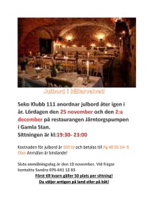 Seko Klubb 111 anordnar julbord åter igen i år. Lördagen den 25 november och den 2:a december på restaurangen Järntorgspumpen i Gamla Stan.