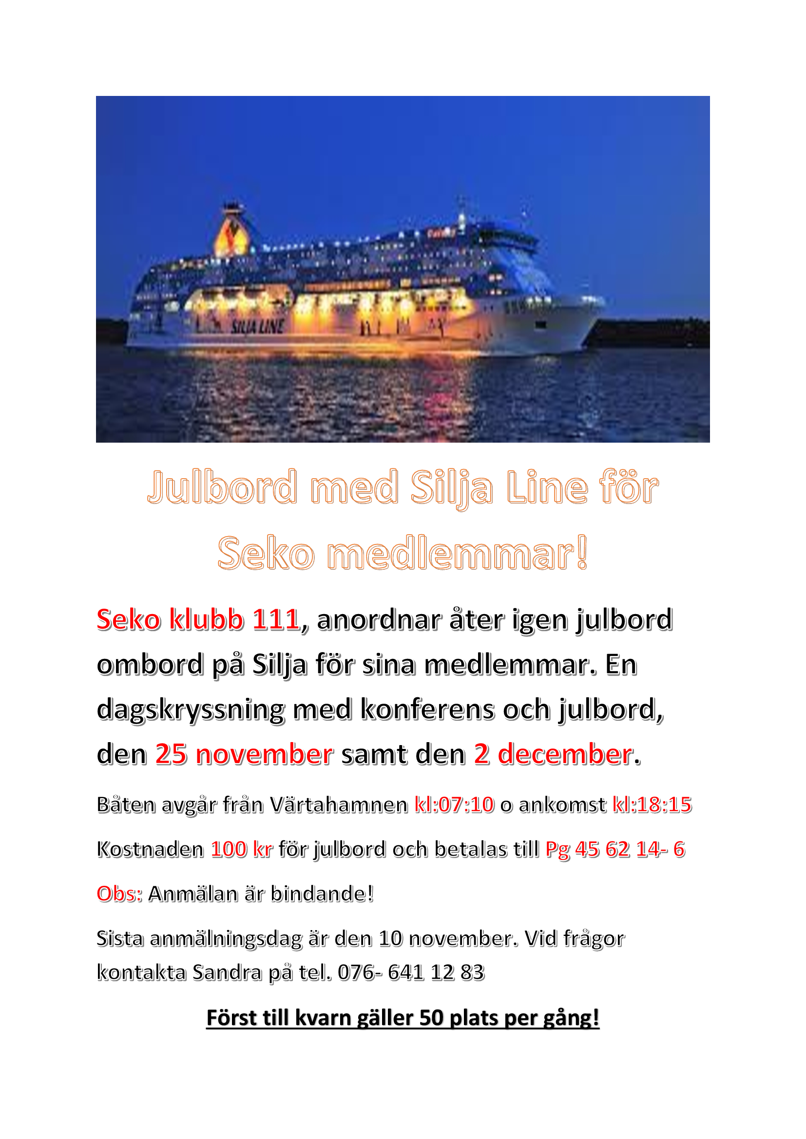 Seko klubb 111, anordnar åter igen julbord ombord på Silja för sina medlemmar. En dagskryssning med konferens och julbord,  den 2 december (fullbokad) och den 9 december (Det har skett en förändring i tidtabellen vilket gör att det inte är möjligt att åka på dagskryssning 25/11 då fartygsbytet inte längre matchar i tidtabell). Vi fick veta det idag, den 23 oktober. Vi ber om ursäkt för detta men tyvärr kunde vi inte påverka det.