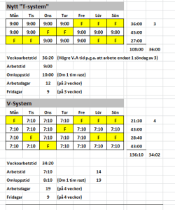 - Ny fridagsgrupp T-system ska börja gälla istället för V-system och ska införas i kollektivavtalet med 9 timmar arbetsdag för heltid depåpersonal natt och klotter. Man arbetar en helg av tre och ha flera fridagar än den fridagsgrupp man har idag.