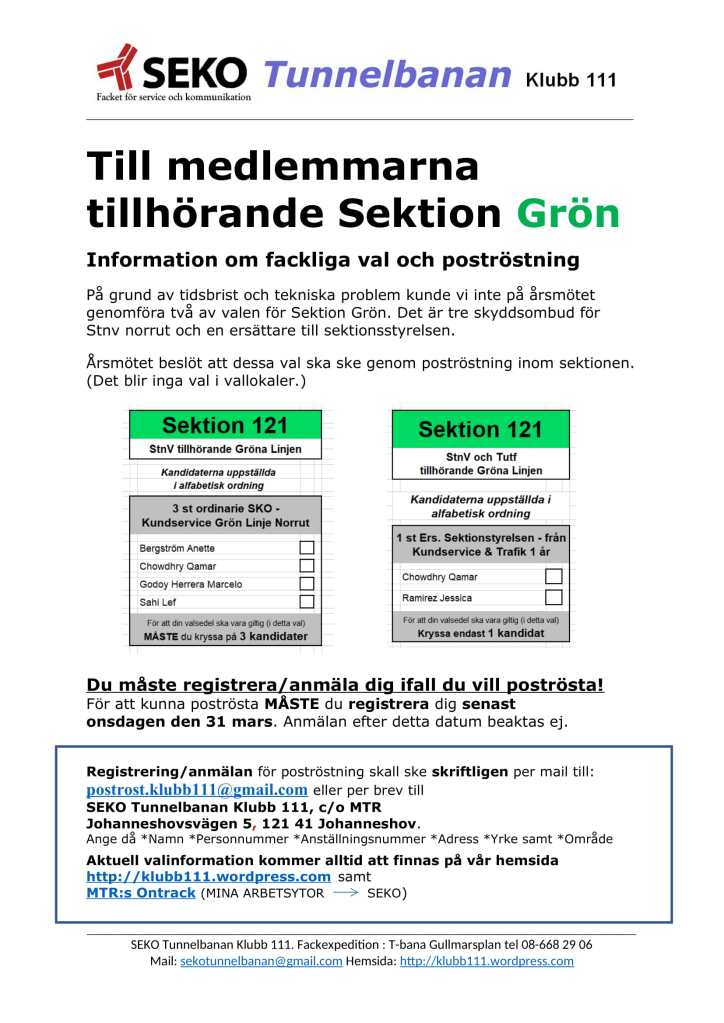 Registrering/anmälan för poströstning skall ske skriftligen per mail till: postrost.klubb111@gmail.com eller per brev till SEKO Tunnelbanan Klubb 111, c/o MTR Johanneshovsvägen 5, 121 41 Johanneshov. Ange då *Namn *Personnummer *Anställningsnummer *Adress *Yrke samt *Område