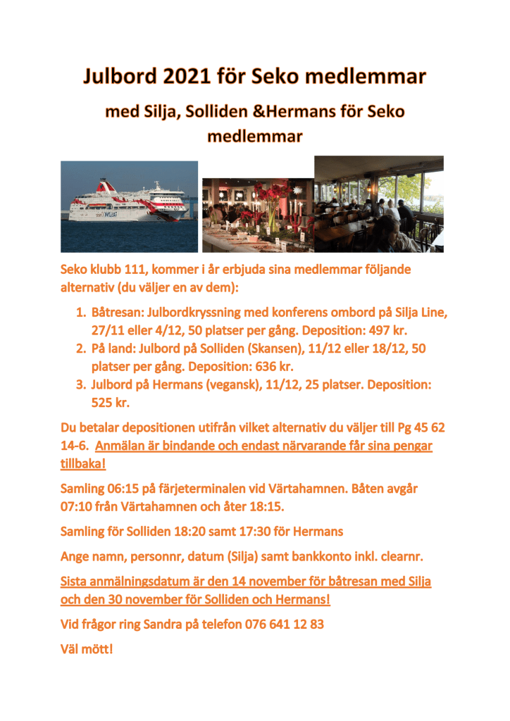 Påminnelse: Seko vill påminna alla att efter förhandlingar som vi har haft, att man har rätt när man deltar i ett informationsmöte som Seko har kallat till (det gäller både medlemsmöte och årsmöte) att få högre kompensation jämfört med tidigare. Förut fick man tid mot tid eller timersättning. Seko och MTR har kommit överens om att ersättningen ska vara enligt följande. Det gäller högst 5 timmar per år och medlem som går på möte på sin fritid. Ersättningen ska vara antingen enkel övertid eller motsvarande kompensationsledighet, dvs 1 timme ska räknas som 1,5 timmar.