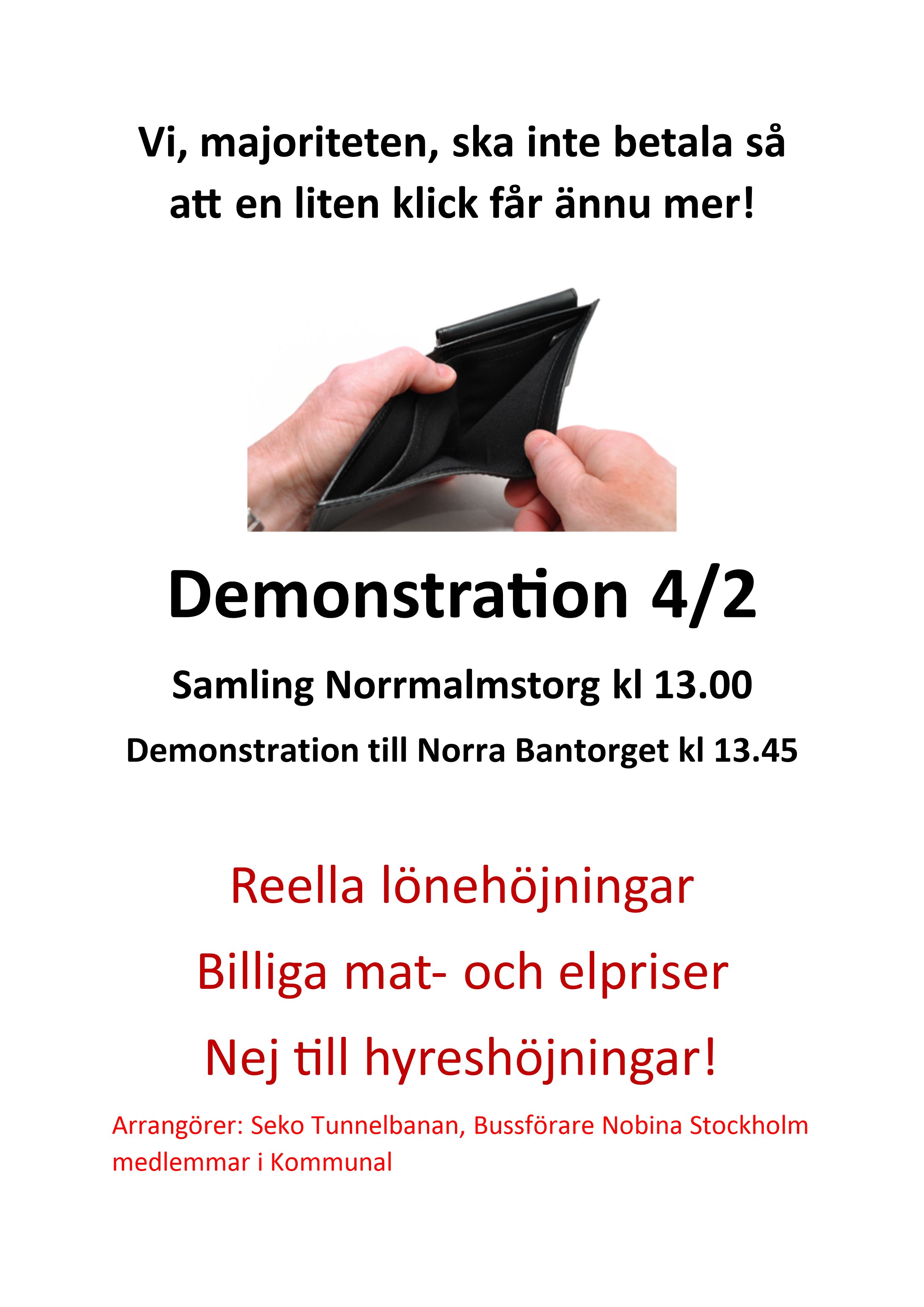 Lördagen den 4:e februari anordnades en manifestation i centrala Stockholm, med demonstration för reella löneökningar och mot prishöjningar på exempelvis el och mat.