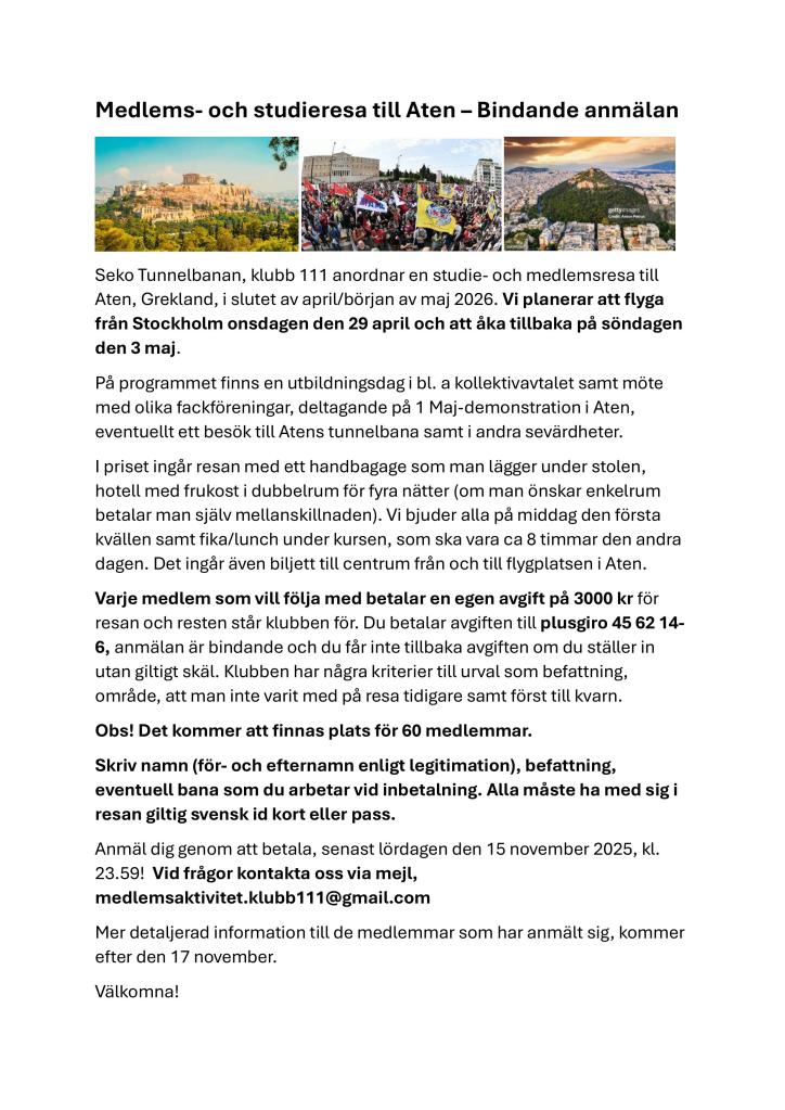 Seko Tunnelbanan, klubb 111 anordnar en studie- och medlemsresa till Aten, Grekland, i slutet av april/början av maj 2026. Vi planerar att flyga från Stockholm onsdagen den 29 april och att åka tillbaka på söndagen den 3 maj.