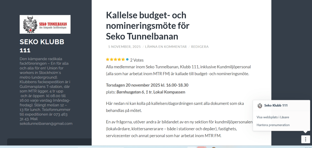 Alla medlemmar inom Seko Tunnelbanan, Klubb 111, inklusive Kundmiljöpersonal (alla som har arbetat inom MTR FM) är kallade till budget- och nomineringsmöte.