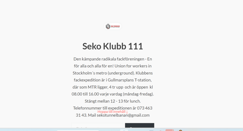 Den kämpande radikala fackföreningen – En för alla och alla för en! Union for workers in Stockholm´s metro (underground). Klubbens fackexpedition är i Gullmarsplans T-station, där som MTR ligger, 4 tr upp och är öppen kl 08.00 till 16.00 varje vardag (måndag-fredag). Stängt mellan 12 – 13 för lunch. Telefonnummer till expeditionen är 073 463 31 43. Mail sekotunnelbanan@gmail.com