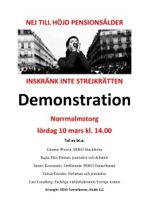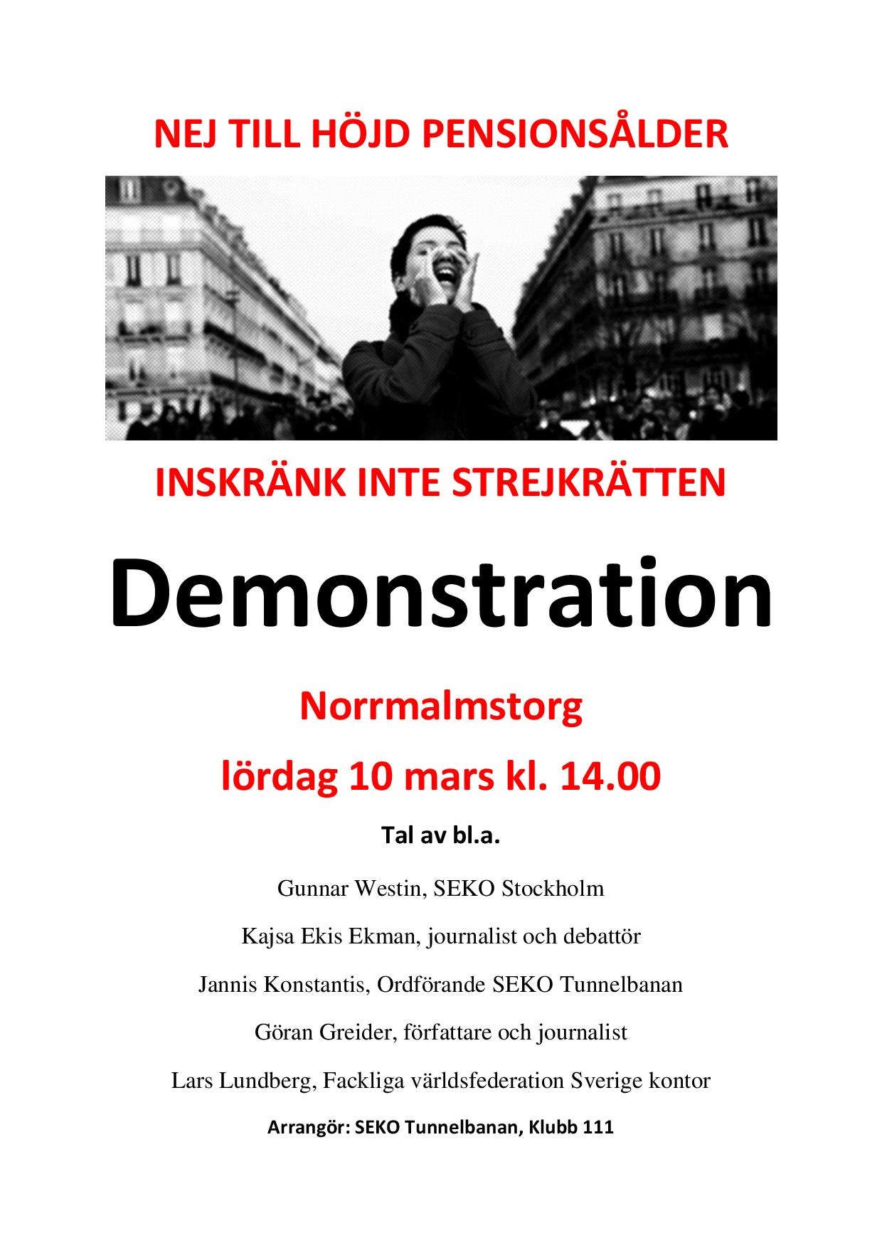 Därför kallar Seko Tunnelbanan alla fackföreningar, alla arbetare och alla organisationer till en demonstration, lördagen den 19 november kl. 12:00 vid Norrmalmstorg i Stockholm samt den 9 december kl 14.00 vid Norra Bantorget.